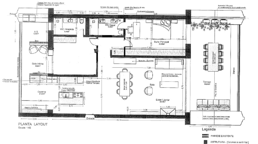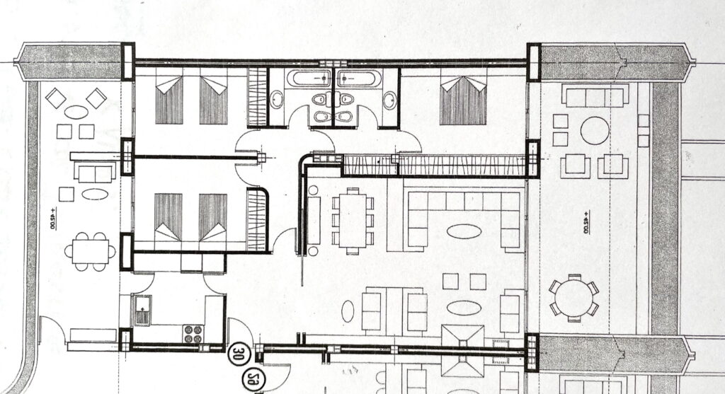 - Primeira planta: a original, de três dormitórios, projeto do arquiteto Fernando Higueras.